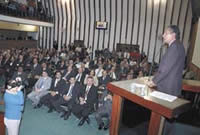80 ANOS DE ACM O deputado Heraldo Rocha (DEM) ocupou a tribuna para o elogio ao senador Antonio Carlos Magalhães com o discurso impresso nas mãos. No entanto, diante do plenário repleto de amigos, parentes e lideranças políticas, preferiu deixar os papéis de lado. "Escrevi mas não vou lê-lo, pois ...