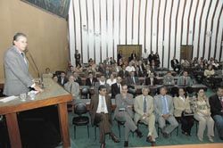 O presidente da Assembléia Legislativa, deputado Clóvis Ferraz (PFL), participou ontem, na sede da Fundação Luís Eduardo Magalhães, da solenidade de inauguração da Galeria de Chefes da Casa Militar do Governador. A galeria homenageia os 13 chefes militares que já passaram pela função. O evento contou com a presença do ...