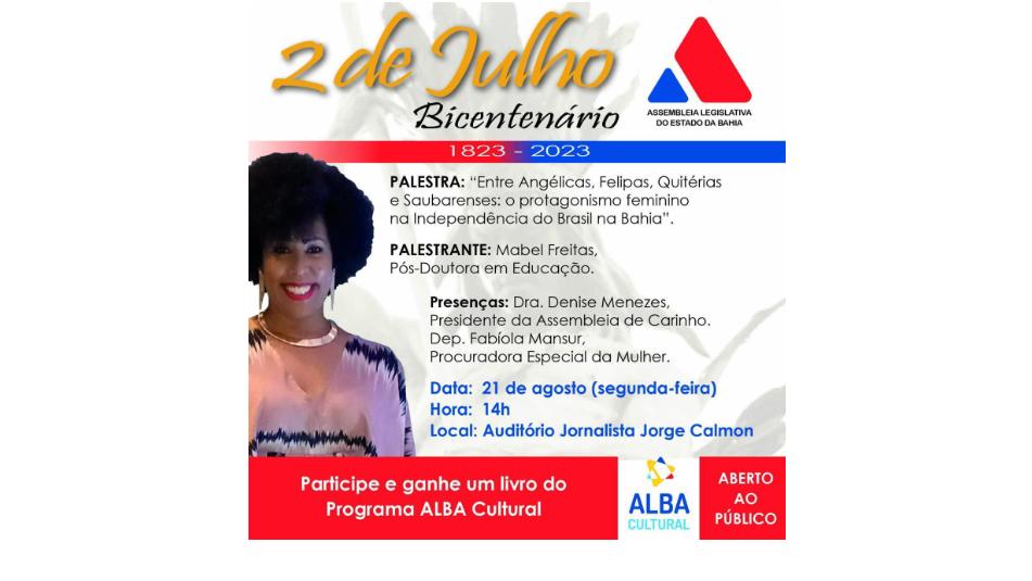 A Assembleia Legislativa (ALBA) promoverá, na próxima segunda-feira (21), às 14h, uma palestra que marcará o encerramento do ciclo de comemorações do Bicentenário da Independência do Brasil na Bahia. Com o tema “Entre Angélicas, Felipas, Quitérias e Saubarenses - O Protagonismo Feminino na Independência do Brasil na Bahia”, o evento ...