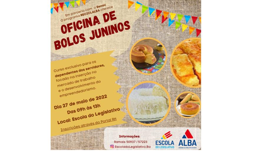 A Escola do Legislativo da Assembleia Legislativa da Bahia (ALBA) promove, nesta sexta-feira (27), das 9h às 13h, uma oficina de bolos juninos exclusiva para os dependentes dos servidores da Casa. A atividade, que será realizada na cozinha do restaurante da ALBA, é fruto de parceria com o Serviço Nacional ...