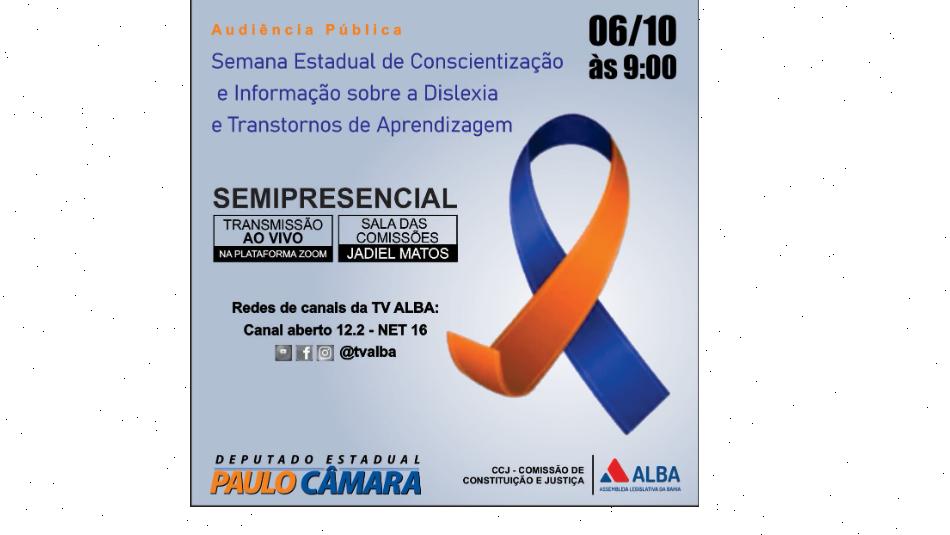 A Comissão de Constituição e Justiça da Assembleia Legislativa da Bahia (ALBA), promove nesta quarta-feira (6), a partir da 9h, uma audiência pública que debaterá a "Semana Estadual de Conscientização e Informação sobre a Dislexia e Transtornos de Aprendizagem". Proposta pelo deputado Paulo Câmara (PSDB), a audiência acontecerá na sala ...