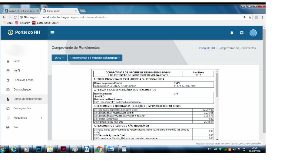 A Superintendência de Recursos Humanos (SRH) da Assembléia Legislativa da Bahia (ALBA) disponibilizou desde o dia 1º deste mês, no Portal do RH, os informes de Rendimento para a Declaração do Imposto de Renda 2018, relativo ao ano base 2017. Desde o primeiro dia de março a Receita Federal já ...