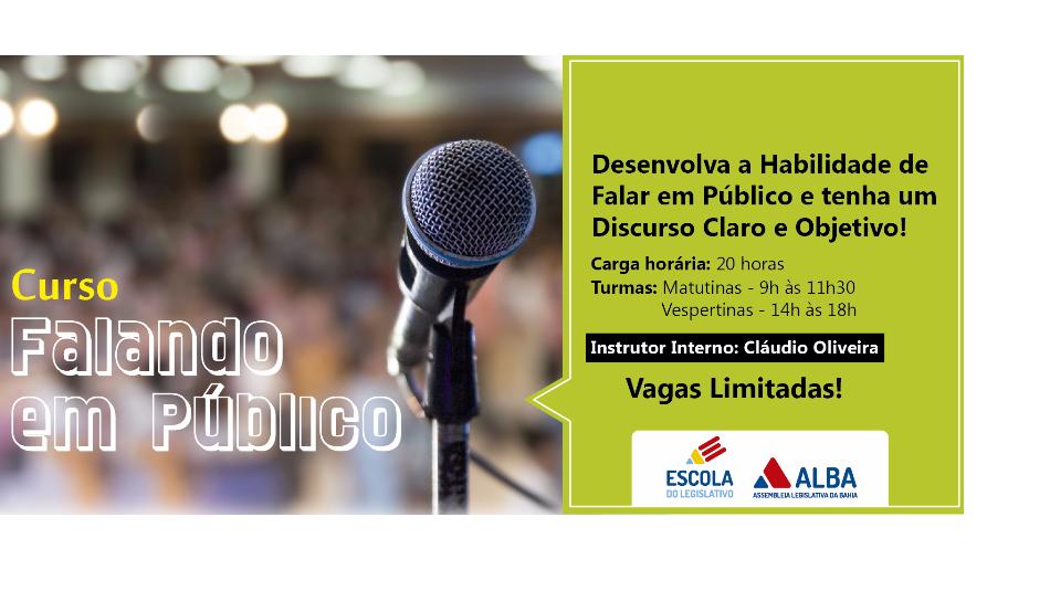 A Escola do Legislativo promove o Curso de Oratória para os Servidores da Casa, nos dias 27 à 30/11, das 14:00 às 18:00 e 01/12, das 9:00 às 12:00, ministrado pelo professor Cláudio Meneses, coordenador do Memorial da Assembleia Legislativa da Bahia (ALBA). Doutor em letras pela UFBA e pertencente ...